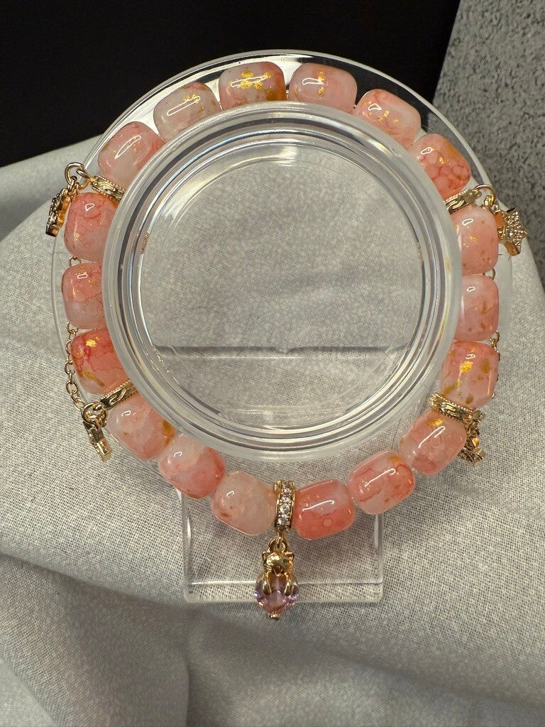 Soft and radiant, our Blush Fortune bracelet features smooth pink beads with delicate gold accents, strung on a comfortable 6.5-inch stretch band. A sparkling gold-tone charm showcases a lucky cat holding a faceted lavender crystal heart, adding a touch of charm and positivity. Perfect for those who love feminine elegance with a hint of playful good fortune.