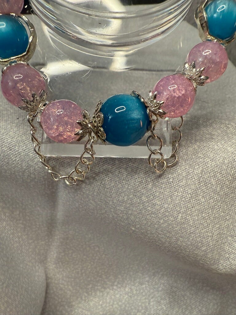 A striking mix of turquoise tiger-eye beads and shimmering pink cracked glass, accented with silver bead caps and chain details. A fun yet elegant piece that adds a pop of color to any look.