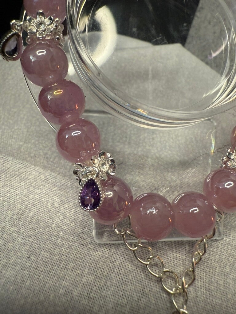 Elegant 7-inch stretch bracelet crafted with smooth rose quartz glass beads, accented by shimmering silver-tone floral bead caps and sparkling amethyst charms. A dangling amethyst centerpiece adds a touch of sophistication, making this piece perfect for both everyday wear and special occasions. Comfortable stretch fit for easy wear.