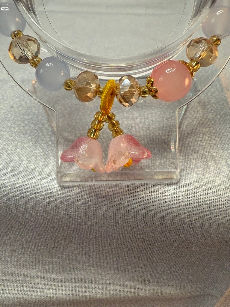 This soft and feminine bracelet features smooth pale blue and pink glass beads paired with faceted champagne crystals for a warm sparkle. Accented with dual pink glass flower charms and golden details, it adds a delicate touch of elegance to any outfit. Perfect for a charming, light, and graceful look.