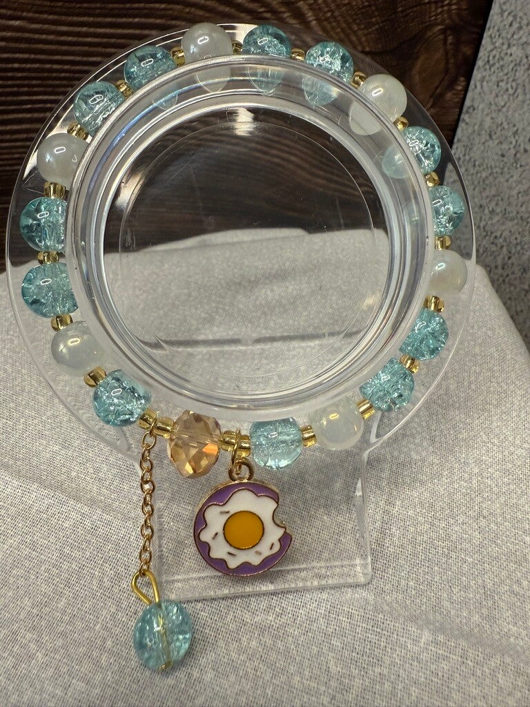 Add a playful twist to your accessories with this adorable aqua and white beaded bracelet, featuring crackle-style beads, smooth moonstone-like accents, and gold spacers for a touch of elegance. The standout charm is a whimsical fried egg pendant outlined in purple, paired with a dangling aqua bead for extra flair. Perfect for anyone who loves cute, quirky, and unique jewelry that sparks conversation.