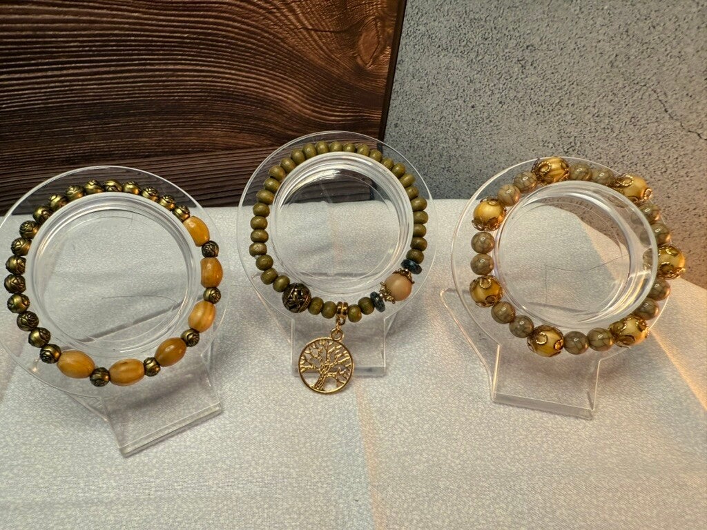 This 6-inch stretch bracelet trio brings together warm, earthy tones and natural charm. Each bracelet is unique—featuring golden amber beads, olive greens, and antique gold accents—yet they complement each other perfectly when stacked. One bracelet is adorned with a detailed Tree of Life charm for added meaning and style. Wear them together for a bold statement or separately for a subtle, natural touch. Handcrafted for comfort, they’re perfect for everyday wear or gifting.