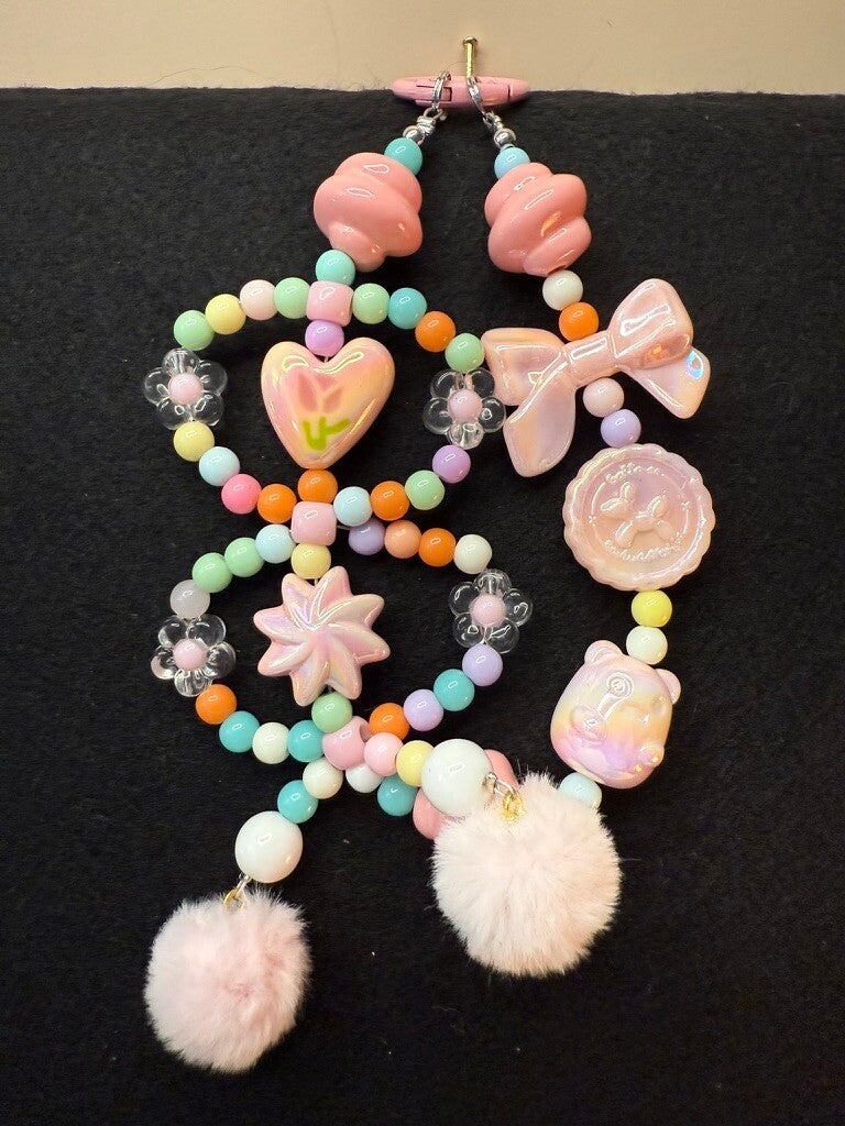This whimsical pastel beaded chain bursts with soft colors, charming shapes, and glossy accents, finished with two fluffy blush puffs for extra flair. Perfect as a keychain, bag charm, or phone chain to add a sweet, playful touch wherever you clip it.