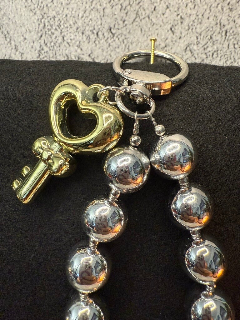 This chic keychain features a shimmering gold heart-shaped key charm paired with a loop of glossy silver acrylic beads. Stylish yet functional, it adds a touch of elegance to your keys, purse, or backpack while offering a bold, eye-catching accessory for everyday use.