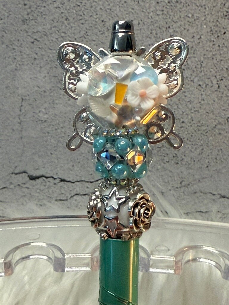 Let your words take flight with the Enchanted Wings pen, adorned with a dazzling crystal butterfly and shimmering turquoise accents. The elegant emerald barrel paired with intricate silver rose detailing makes it a true statement piece. Includes free ink refills so your inspiration never fades.