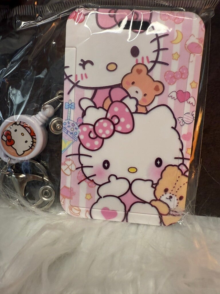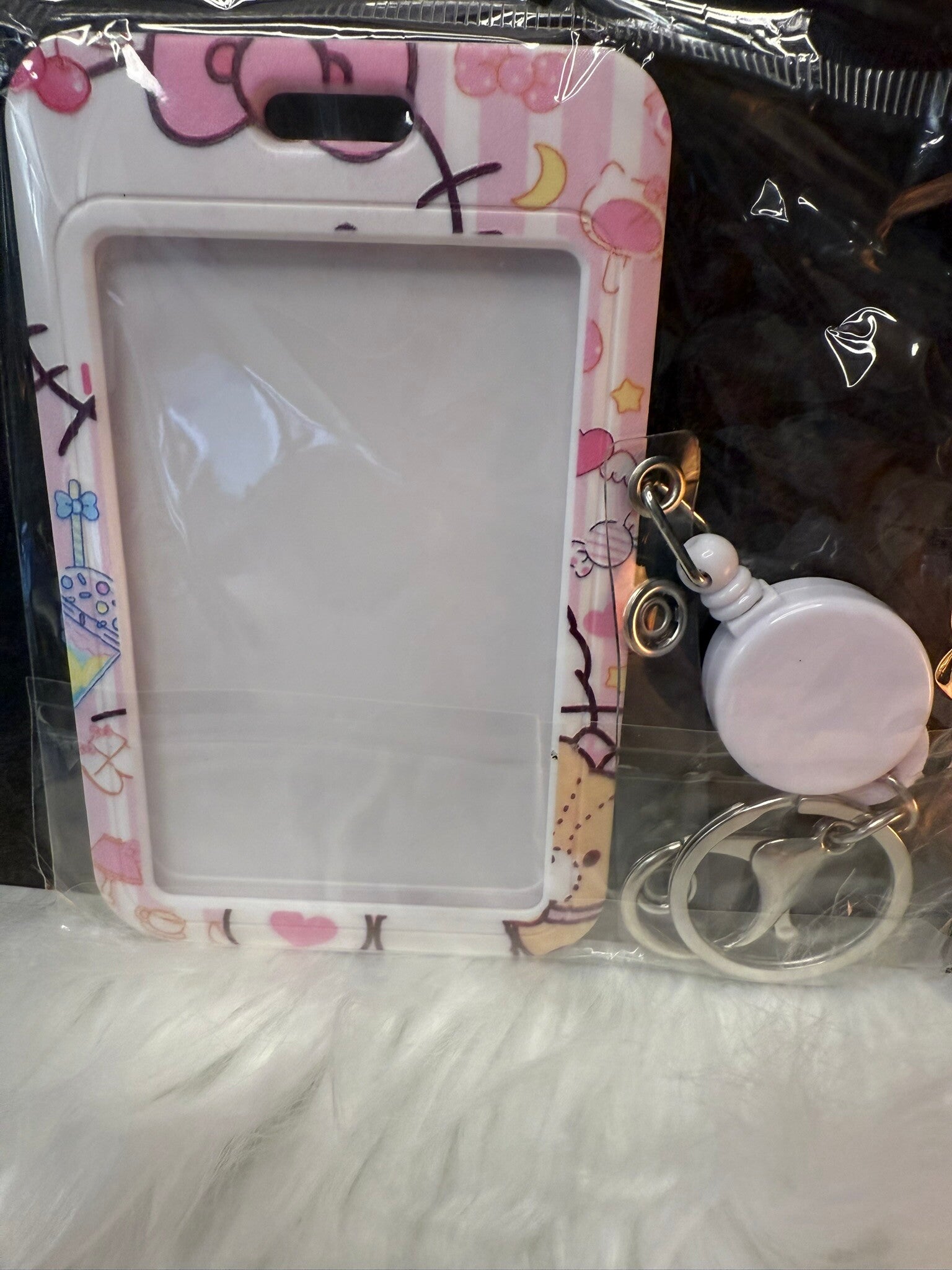 Bring a dose of cuteness to your everyday with this pastel pink Hello Kitty badge holder! Featuring Hello Kitty cuddling her teddy bear against a dreamy background of bows, stars, and moons, this set includes a matching lanyard and retractable reel for easy access. Perfect for holding ID cards, passes, or keys while showing off your love for Sanrio’s most iconic character. Durable, lightweight, and irresistibly adorable — a must-have for Hello Kitty fans!