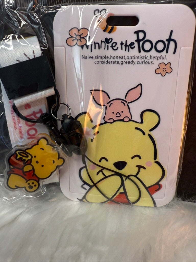 Adorable Winnie the Pooh-themed ID badge holder featuring a smiling Pooh and Piglet design with playful text. Comes with a matching printed lanyard and a cute Pooh keychain charm. Perfect for holding ID cards, passes, or small essentials while adding a touch of character charm to your daily routine. Ideal for school, work, or conventions.