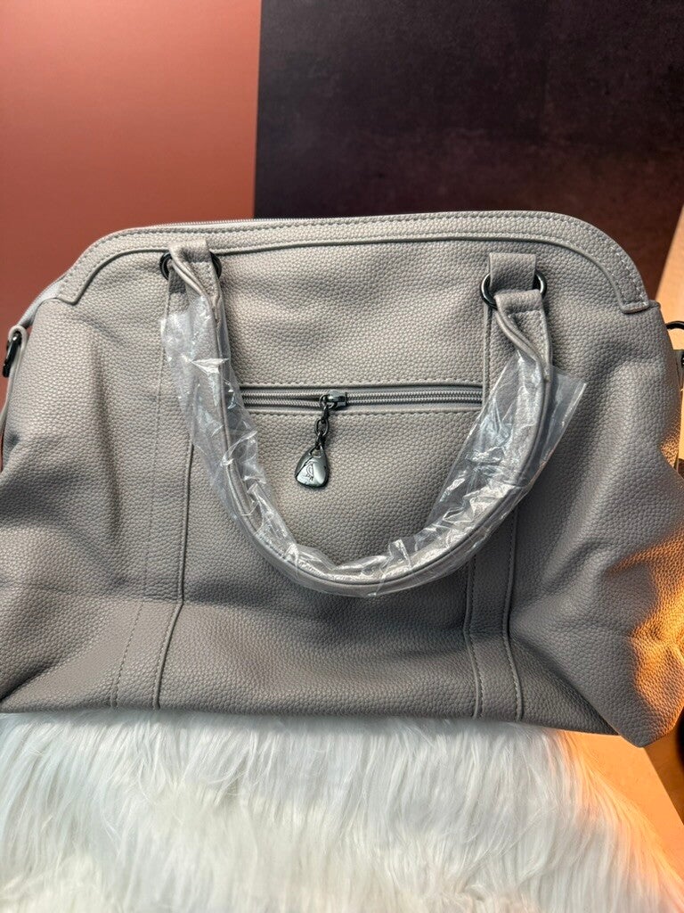 This stylish gray vegan leather tote is the perfect blend of fashion and function. Designed with a spacious interior, sturdy dual handles, and an adjustable strap, it’s ideal for both work and casual outings. The pebbled texture adds a sophisticated touch, while the detachable crystal-accented bear charm gives it a playful, unique flair. Durable, versatile, and chic—this bag is ready to be your new everyday favorite.