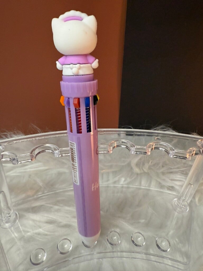Add a pop of cuteness to your writing with this Hello Kitty 10-color multicolor pen! Featuring a charming lavender body adorned with adorable Hello Kitty graphics and topped with a 3D Hello Kitty figurine in a matching pink bow and outfit, this pen is perfect for school, work, or journaling. With 10 vibrant ink colors in one, you can easily switch between shades for notes, doodles, and creative projects—all while showing off your love for Hello Kitty. Functional, fun, and oh-so-collectible!