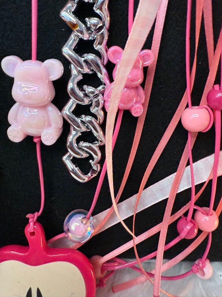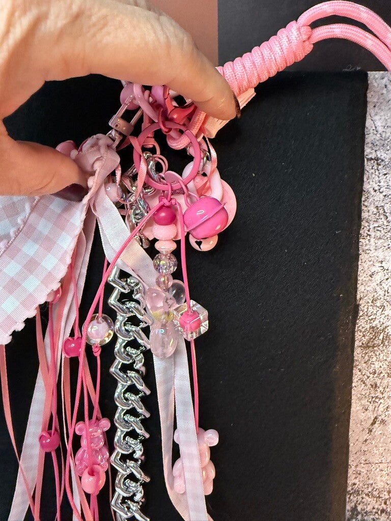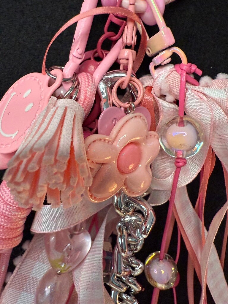 This delightful bag charm bursts with playful pink perfection, featuring a cascade of gingham ribbons, glossy beads, acrylic bears, and shimmering chains. Adorned with sweet details like a pink heart mirror, a cheerful daisy charm, and a happy-face medallion, it’s the ultimate statement accessory for anyone who loves a touch of whimsy. Soft satin ribbons mingle with glossy metallic accents, while layered textures—from knotted cord to dangling trinkets—create a fun, eye-catching look. Clip it to your purse, backpack, or keyring to instantly brighten your day with charm and color.