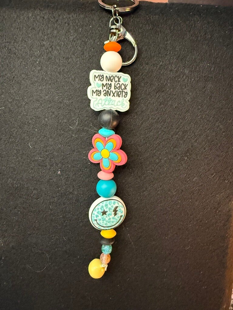 Fun, colorful, and full of personality, this silicone beaded keychain features the playful quote “My Neck, My Back, My Anxiety Attack” alongside vibrant silicone beads in bold shapes and colors. Accented with a groovy flower charm and a glittery turquoise smiley face, it’s the perfect quirky accessory to brighten up your keys, bag, or backpack. Durable and lightweight, it’s designed for both style and everyday use.