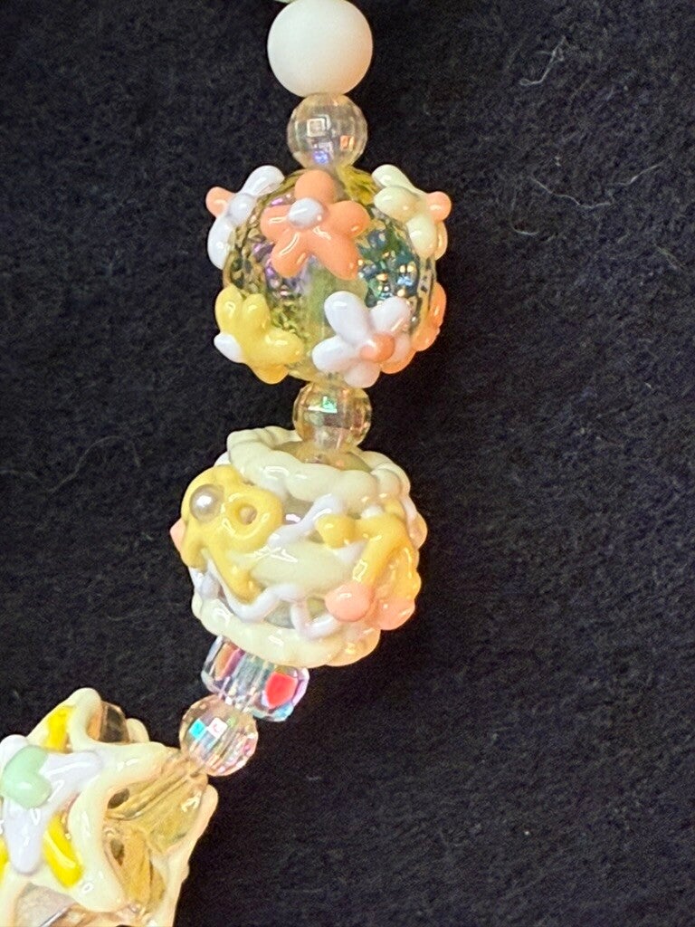 Sweet and sunny, this charm strand is built from hand-painted statement beads in buttery lemon, mint, and blush tones with glossy “icing” details, tiny florals, and iridescent sparkle. Feature beads include dainty bows, a whimsical hot-air balloon, and dome and cube beads piped with raised accents for a cake-decor vibe. Each bead is painted and finished by hand, so no two strands are exactly alike—your piece will be truly one-of-a-kind. Lightweight yet eye-catching, it’s lovely as a keychain, bag charm, or phone chain, and just as perfect to clip on planners, zipper pulls, or display on a vanity. Finished with AB crystal spacers for extra shimmer, this pastel beauty turns everyday carry into dessert-level cute.