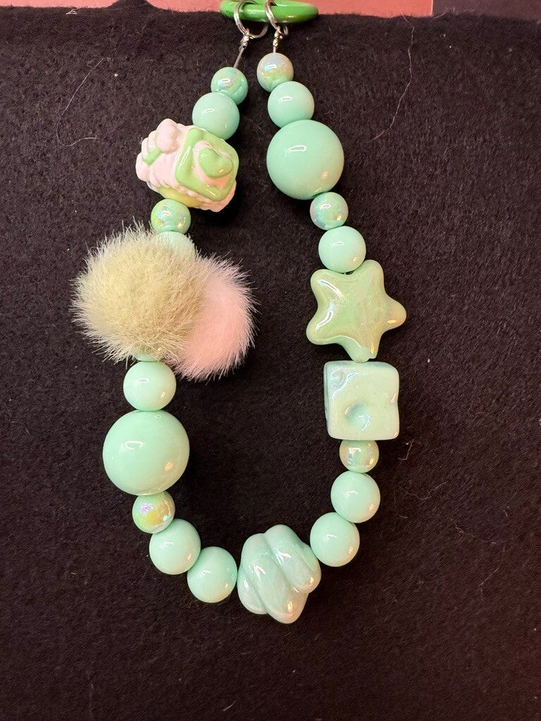 Soft and dreamy in monochrome mint, this handcrafted charm mixes glossy acrylic/resin beads (rounds, star, square, and twist) with a duo of plush mini pom-poms for extra texture. A cute sculpted focal bead tops the strand, and sturdy matching hardware (clip + split ring) lets you use it three ways—clip to keys, dress up a tote or backpack, or attach to a phone case with a lanyard loop. Lightweight, eye-catching, and gift-ready.