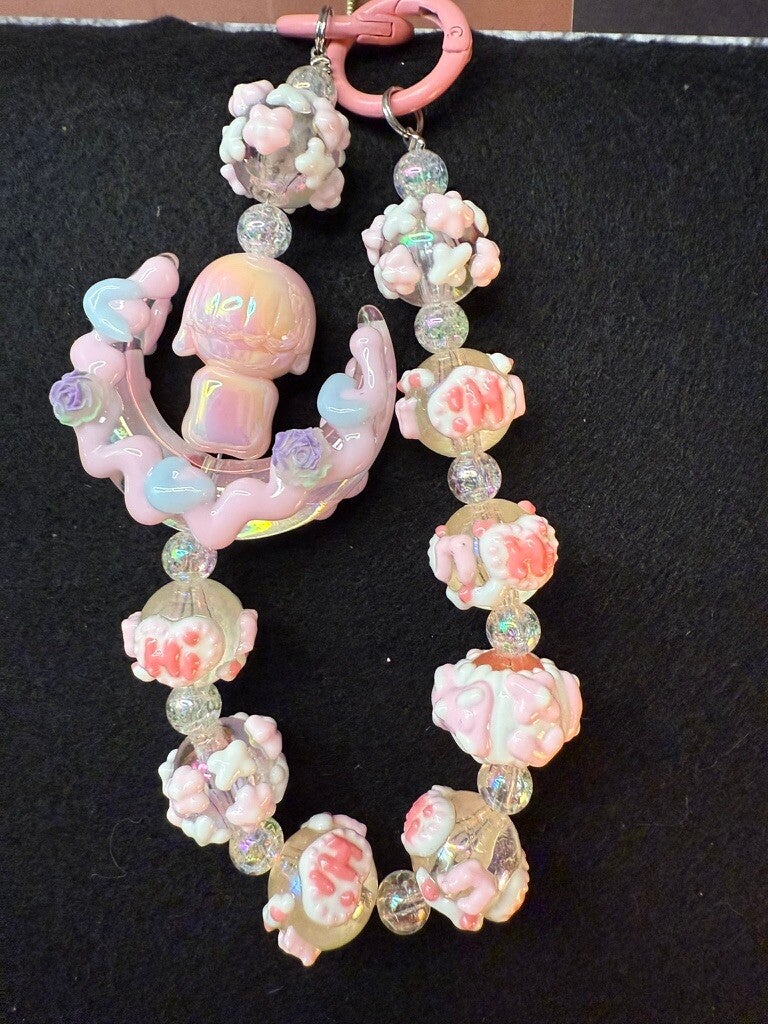 Sugar-sweet and dreamy, this charm features a glossy crescent-moon focal with a tiny figure perched inside, surrounded by my hand-painted “frosted” beads, crackle glass, and iridescent accents. Finished with a pink carabiner clasp, it clips to keys, handbags, backpacks, or a phone case loop for instant kawaii sparkle.