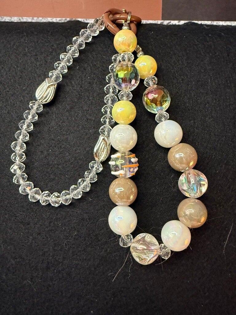 Hand-strung statement charm featuring milky opal-look rounds, warm sand marbles, lemon-yellow faceted glass, and AB rainbow crystals, finished with gold accents and tulip caps. Comes with a detachable clear-crystal mini strap so you can style it as a bag charm, wristlet, phone strap, or key fob. Lightweight, sparkly, and one-of-a-kind—your everyday sunshine.