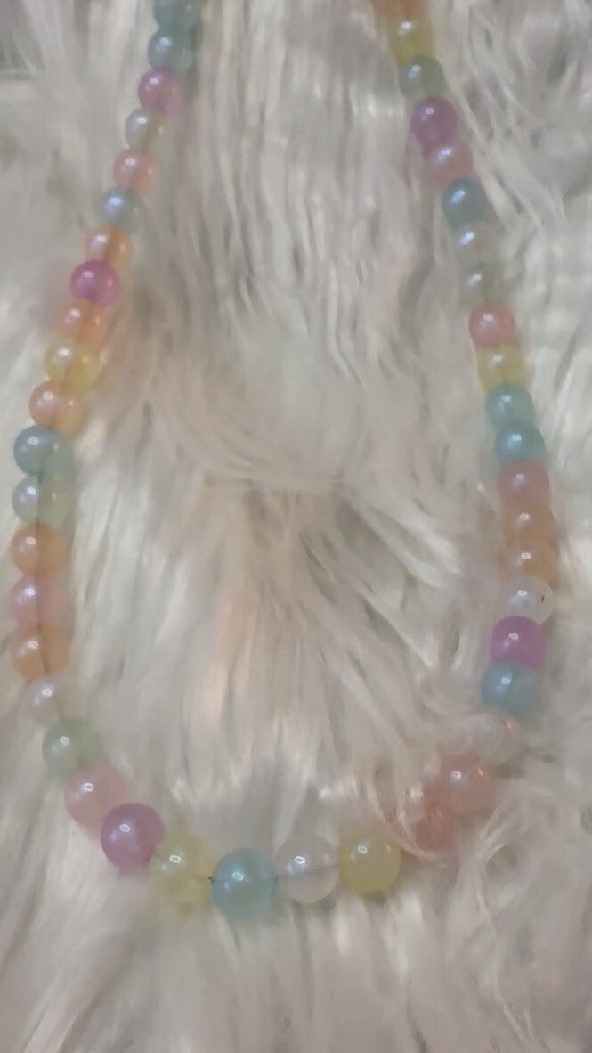 A dreamy, extra-long strand of opalescent beads that glow in rainbow pastels. Iridescent rounds are sprinkled with tiny hearts and floral accents, then finished with sturdy silver lobster clasps so you can clip it anywhere. Wear it as a crossbody strap, loop it as a shoulder/bag chain, or attach it to a phone case for a luxe, candy-cloud vibe. Lightweight, smooth to the touch, and made to shine from every angle.