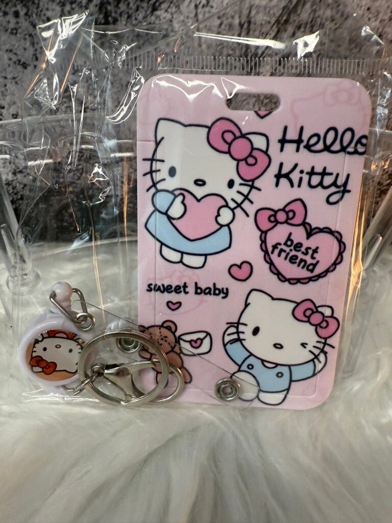 Carry your ID in adorable style with this Hello Kitty “Sweet Baby” badge holder set. Featuring a soft pink background with cute Hello Kitty and teddy bear designs, this set includes a matching lanyard, protective badge cover, and coordinating keychain charm. Perfect for work, school, or events, it combines practicality with playful charm for any Hello Kitty fan.