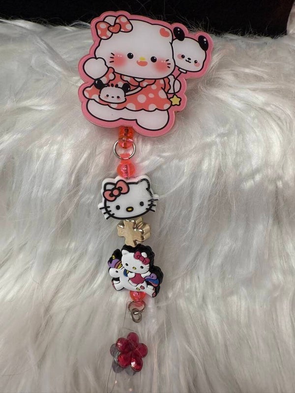 Bring a burst of cuteness to your workday with our Hello Kitty & Pochacco Paradise Triple Charm Badge Reel! Featuring an adorable Hello Kitty in a polka dot dress cuddling her panda friend, a sparkling rhinestone accent, and Hello Kitty riding a magical unicorn, this reel is all about charm and personality. The pink floral clip at the bottom adds a final touch of whimsy, making it perfect for nurses, teachers, office staff, or anyone who loves to accessorize their ID with style. Durable, lightweight, and designed to keep your badge secure while showing off your personality—this piece makes a thoughtful gift or a fun treat for yourself!