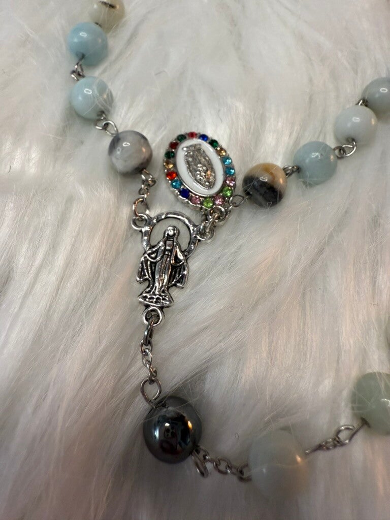 The rosary features a silver-toned crucifix and centerpiece, adorned with colorful rhinestones surrounding the Virgin Mary, adding both brilliance and devotion. The Amazonite beads bring a serene and grounding energy, while the Hematite beads add strength, stability, and protection.