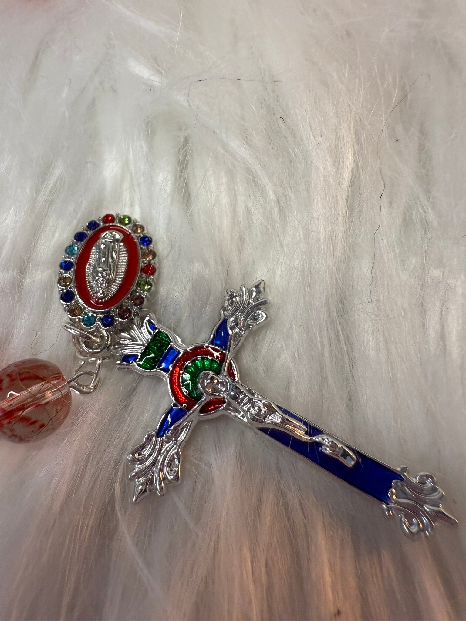 The crowning glory of this rosary is its ornate crucifix, adorned with vibrant enamel in deep blue, radiant red, and lush green, surrounded by sparkling rhinestones that catch the light with every movement. The crucifix’s intricate design and colorful accents make it a radiant symbol of hope, devotion, and everlasting love.