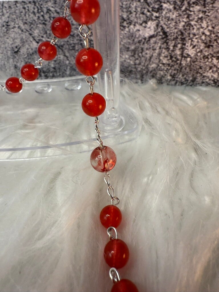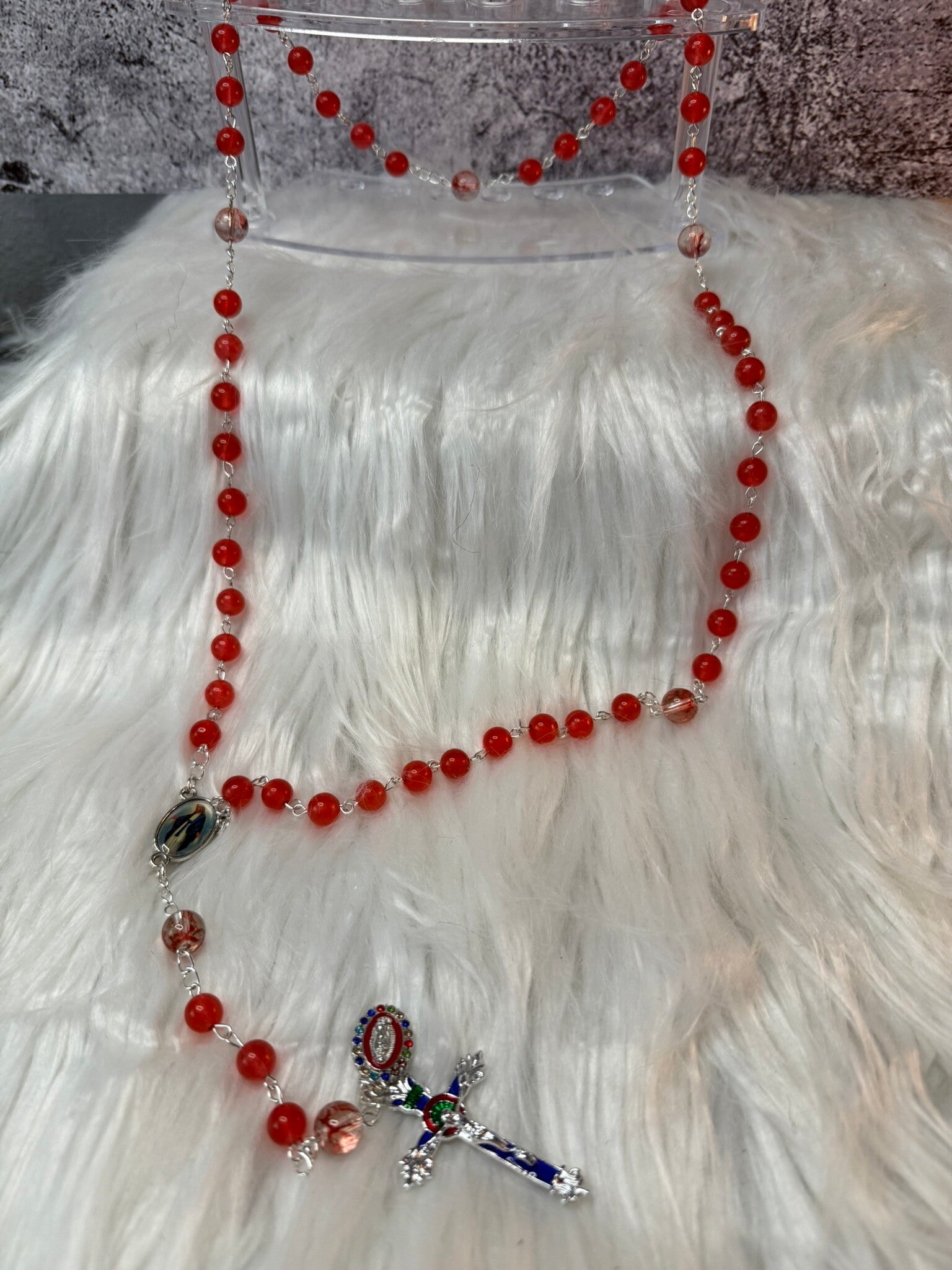 This exquisite rosary is a breathtaking piece of devotion, carefully crafted with natural red agate stone beads. Each bead carries its own unique shade and depth, ranging from rich crimson to translucent fire-like tones, creating a stunning visual rhythm as they are linked together. The natural luster of red agate adds warmth and elegance, symbolizing strength, grounding, and protection, making it not only a prayer tool but also a meaningful keepsake.