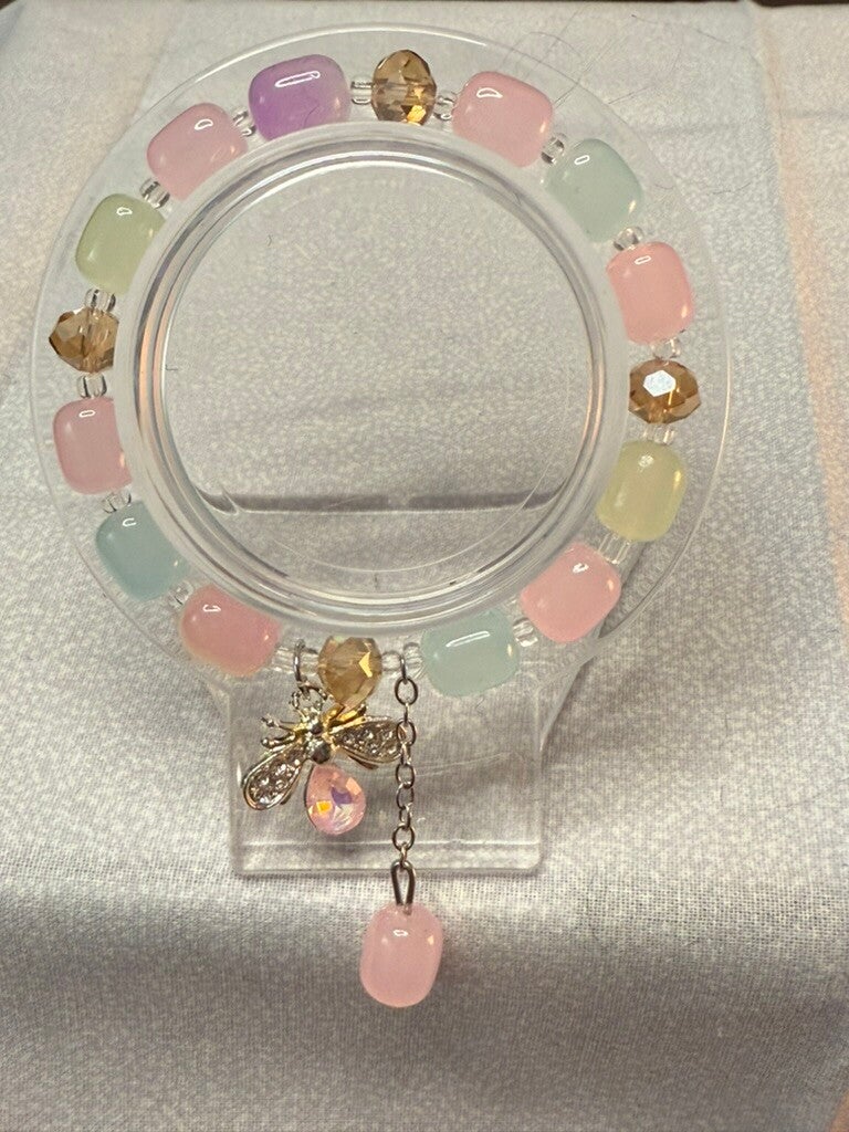This delicate 6-inch stretch bracelet features smooth pastel cube beads in soft shades of pink, lavender, mint, and ivory, paired with sparkling faceted crystals for an elegant shimmer. The highlight is a charming silver bee pendant, adorned with rhinestones and a teardrop crystal dangle, symbolizing resilience, harmony, and positive energy. Its petite size makes it perfect for smaller wrists or as a thoughtful gift for a child or young teen.