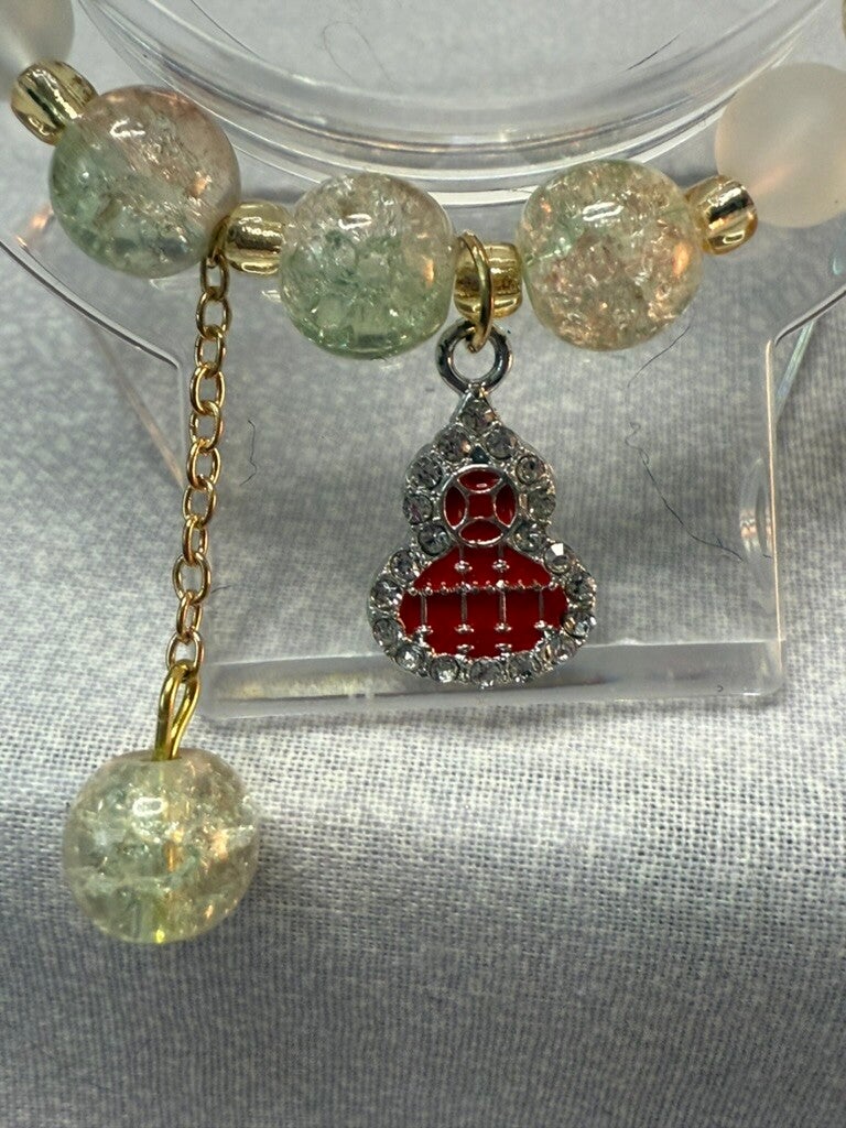 Add a touch of radiance to your collection with this beautiful 6” stretch bracelet, crafted with shimmering crackle glass beads in soft green tones, accented by frosted white beads and golden spacers. At its center, a sparkling red charm outlined with rhinestones brings a bold pop of color, making this piece truly unique. A dangling bead on a gold chain adds movement and elegance, giving the bracelet an extra hint of sophistication.