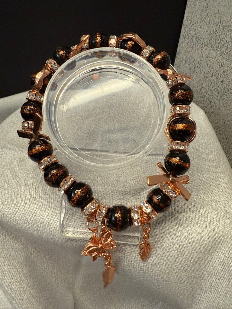 This elegant 7" stretch bracelet features shimmering black beads with coppery-gold accents, perfectly paired with sparkling rhinestone spacers and rose gold hardware. Adorned with delicate butterfly, Bows & leaf charms, this piece offers both sophistication and a touch of nature-inspired beauty. The stretch design ensures a comfortable fit, making it a versatile accessory for both everyday wear and special occasions.