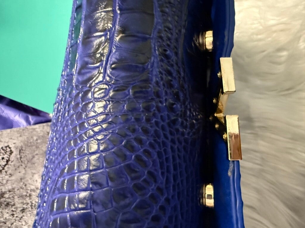 Turn heads with this bold royal blue croc-embossed handbag crafted from premium vegan leather. Featuring a structured silhouette, top handle, and gold “V” hardware, this bag combines luxury style with everyday practicality. The set includes a detachable long strap for versatile crossbody wear and a matching wallet for a complete, coordinated look. Spacious interior with zippered compartments keeps essentials organized while adding sophistication to your outfit. Perfect for both professional and evening occasions.