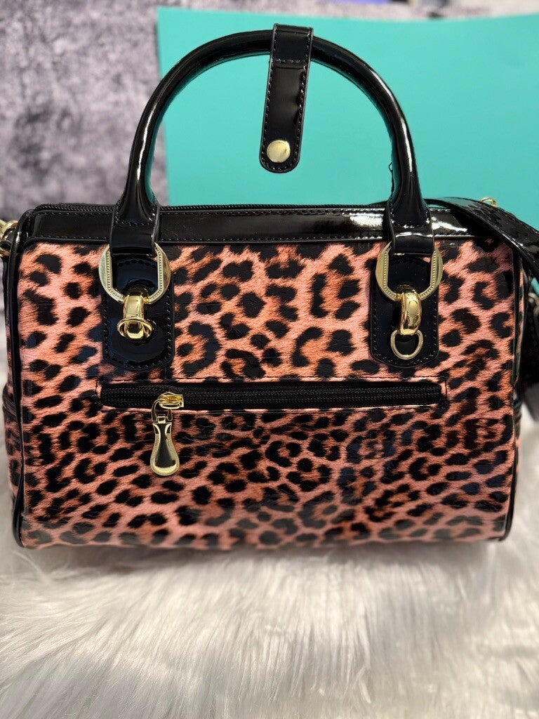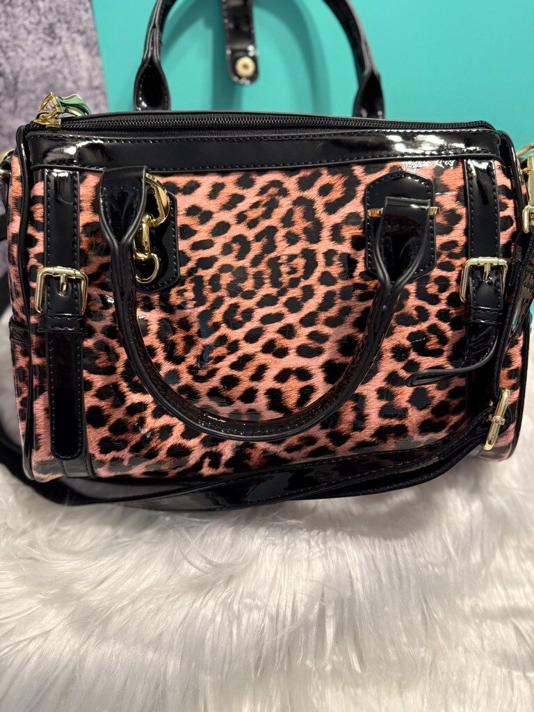 Turn heads with this glossy leopard-print satchel that shines as bright as your confidence. The patent leather–style finish gives it a sleek, high-glam look, while the black polished trim and gold hardware add luxe detailing. Designed with both top handles and a detachable strap, this bag transitions effortlessly from daytime chic to night-out glam. Spacious inside, it’s the perfect mix of fashion and function.