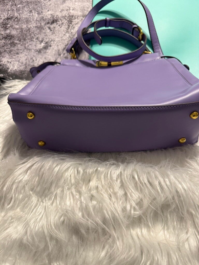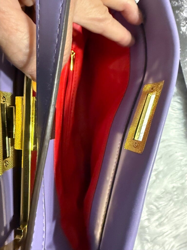 Make every outfit pop with this stunning lavender handbag crafted in smooth vegan leather. Designed with structured lines, gold-tone hardware, and a secure turn-lock closure, this bag brings elegance and everyday function together. The roomy interior is perfect for your essentials, while the sturdy top handles and adjustable strap let you style it as a tote or shoulder bag. Polished feet at the bottom add a refined finish while protecting your bag. A bold yet classy choice for work, brunch, or an evening out.