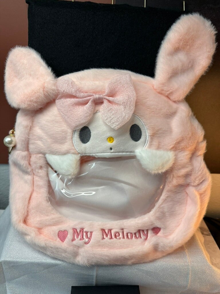 Sweet, soft, and oh-so-kawaii! This My Melody plush bag is a dream come true for Sanrio lovers. Designed with fluffy pastel pink plush, it features My Melody’s cute face, long bunny ears, and a delicate pink bow. The embroidered “My Melody” logo at the bottom adds a charming finishing touch.