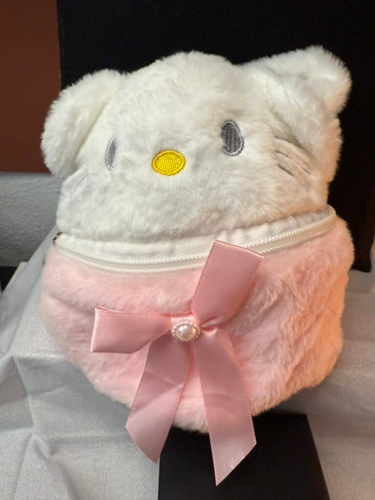 Soft, sweet, and full of charm – this Hello Kitty-inspired plush bag is the perfect accessory for any kawaii lover! Made from fluffy white and pastel pink fabric, it features Hello Kitty’s signature face with embroidered details and a dainty pink satin bow topped with a pearl accent.