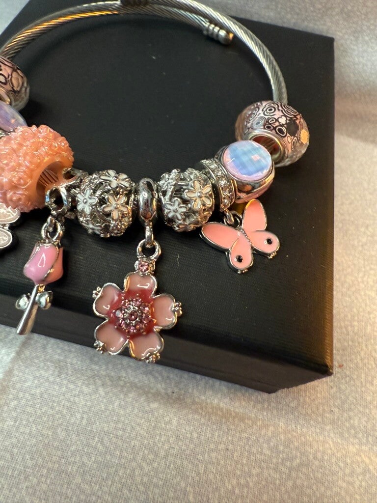 The Blush Dreams Charm Bracelet is a delicate mix of elegance and charm, featuring soft pinks and shimmering silver accents. This unique piece includes enchanting charms such as a four-leaf clover for luck, a rose for romance, a butterfly for transformation, and a blooming flower for beauty. Intricately detailed silver bead spacers and textured pink glass accents tie the look together, making it both feminine and bold. Perfect for adding a touch of sweet sophistication to any outfit or gifting as a keepsake of love, luck, and positivity.