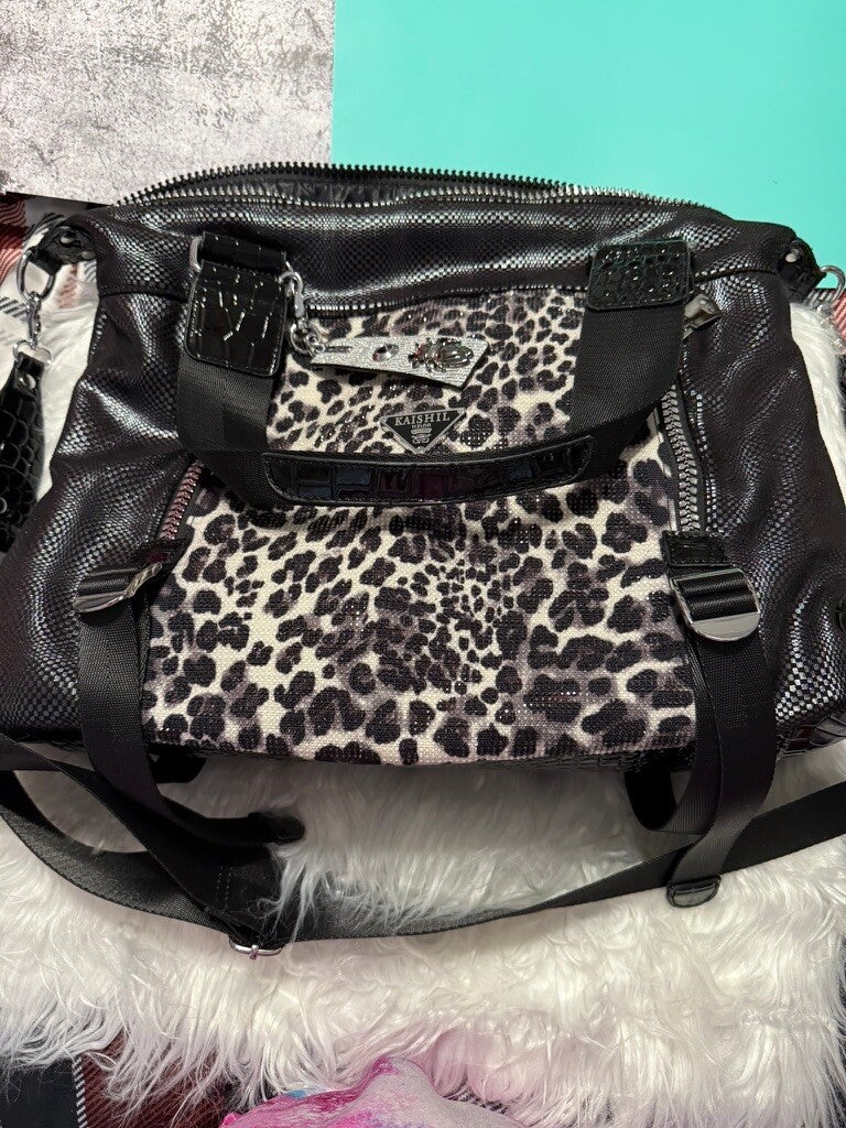 Unleash your bold side with this striking KAISHIL statement handbag, blending edgy textures with wild elegance. The centerpiece features a sparkling leopard-print front panel accented with black textured faux leather and shiny chrome details. Unique embellishments and hardware elevate the bag into a true fashion-forward piece.
