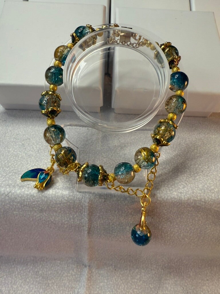 Add instant elegance with this 7-inch handcrafted bracelet featuring shimmering teal-and-gold glass beads, accented with luxe golden findings. A dangling bead and enamel leaf charm bring a playful touch of color, while the magnetic closure makes it easy to wear yet secure. Strung on durable wire, this bracelet blends sophistication with practicality—perfect for elevating your everyday look or gifting someone special.