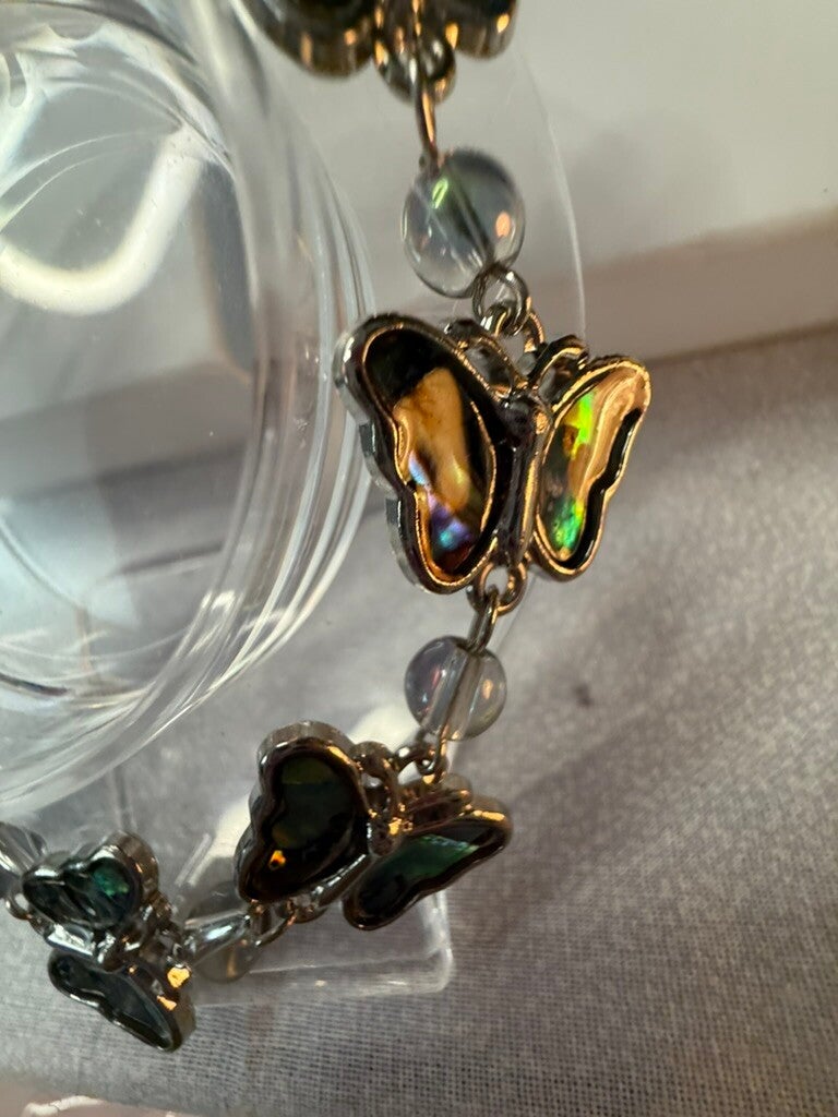 Delicate yet bold, this 7-inch handcrafted bracelet features shimmering abalone-style butterfly links that shift with color in the light, creating an enchanting rainbow effect. Translucent accent beads add a soft glow, while the silver bow clasp gives the piece a graceful finishing touch. Strung on durable wire for long-lasting wear, this bracelet is a true statement of nature-inspired elegance—perfect for butterfly lovers and anyone who wants a unique piece that sparkles with every move.