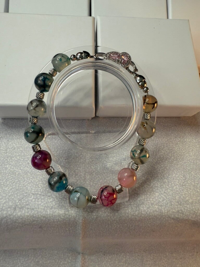 This 7.25" bracelet shines with multicolored gemstone-style beads in rich shades of teal, pink, amber, and red, each separated by textured silver spacers for a refined finish. The highlight of this piece is the sparkling heart-shaped clasp, adorned with pink rhinestones that add a touch of romance and glamour.