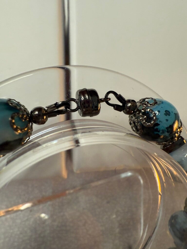 This elegant 6.5-inch bracelet showcases striking blue-toned glass beads with natural marbling, beautifully accented by intricate black butterfly charms adorned with sparkling blue rhinestones. The magnetic clasp ensures easy wear while keeping the bracelet secure. A perfect balance of charm and sophistication, this piece is ideal for dressing up or adding a pop of color to everyday style.