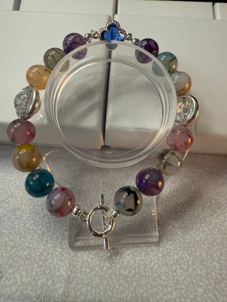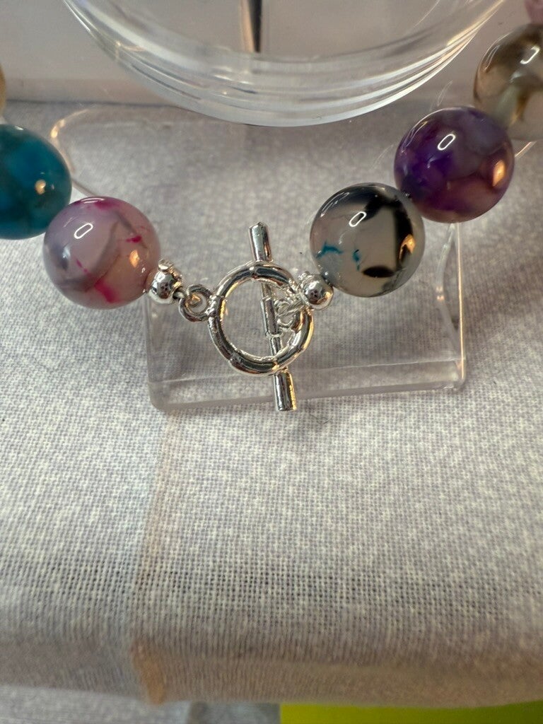 6.5" Multi-Color Agate Bracelet with Silver Toggle Closure & Blue Gem Accent IDB100209