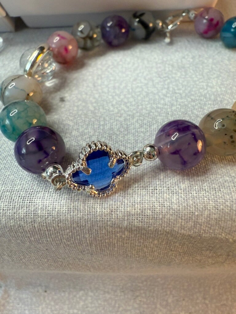 This exquisite 6.5-inch bracelet is crafted with polished multi-color agate beads, each offering unique natural patterns in shades of purple, teal, golden yellow, smoky gray, and soft pink. At its center, the bracelet features a striking blue gemstone accent, framed in a silver setting that adds an elegant focal point.