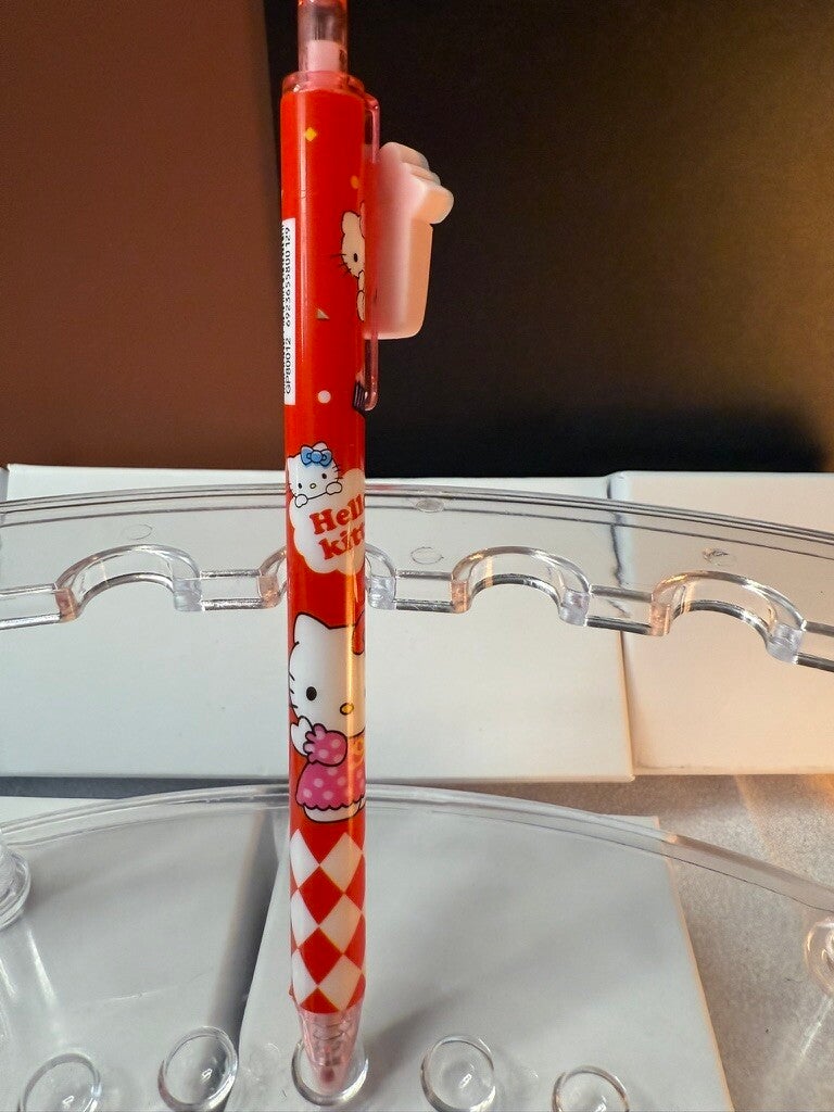 Write in style with this adorable Hello Kitty click pen featuring a fun 3D Hello Kitty cellphone topper! The bright red barrel is decorated with Hello Kitty graphics and a charming diamond-check pattern, making it a standout piece in any kawaii stationery collection.