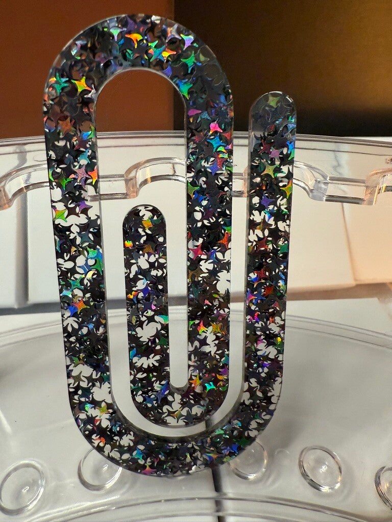 Add a pop of bold color to your workspace with this Gray/Black/Silver Star Glitter Mega Paperclip! Oversized and durable, this acrylic clip is filled with shimmering holographic red stars that sparkle brilliantly under any light. Perfect for keeping notes, homework, bills, or photos together, it also doubles as mini desk décor that makes organization fun and stylish.