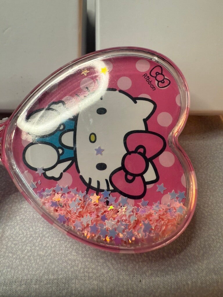Add a pop of kawaii charm to your beauty routine with this adorable Hello Kitty Heart Glitter Comb Brush! Shaped like a heart and filled with floating pink and iridescent star glitter, this brush sparkles with every shake—making hair care feel extra magical. The front features Hello Kitty with her classic bow on a pink polka dot background, combining cuteness with everyday practicality.