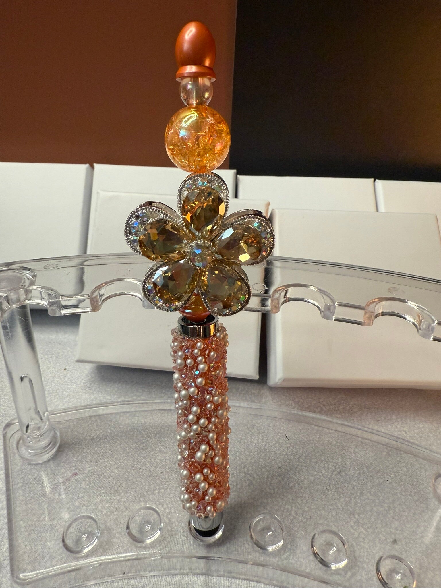 Handmade Pearl & Rhinestone Stylus Pen – Orange Beadable Luxury Writing Tool IDP100081