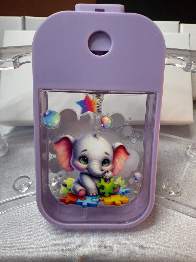 Add a touch of cuteness to your everyday essentials with this whimsical refillable spray bottle, featuring an adorable baby elephant design. Made with a durable acrylic shell and a soft pastel purple finish, this compact mister is perfect for hand sanitizer, perfumes, refreshing face mists, or any liquid sprays you love to carry. The charming elephant surrounded by bubbles and puzzle pieces makes it extra fun for both kids and adults. Its slim, pocket-friendly size slips easily into purses, backpacks, or lunch bags, making it practical for on-the-go use while keeping your routine playful and stylish.