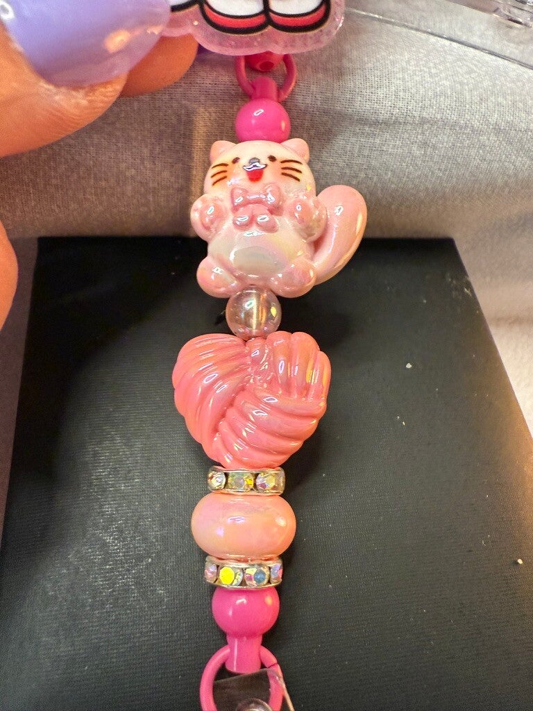Add some fun and function to your everyday look with this adorable Hello Kitty spinner badge reel! Featuring a glittery pink Hello Kitty topper that spins for extra flair, this reel is accented with a charming pink cat bead, glossy swirl bead, and sparkling rhinestone spacers. The reel extends easily for swiping or scanning your ID, making it perfect for nurses, teachers, students, or office staff who want to keep their badge handy in style.
