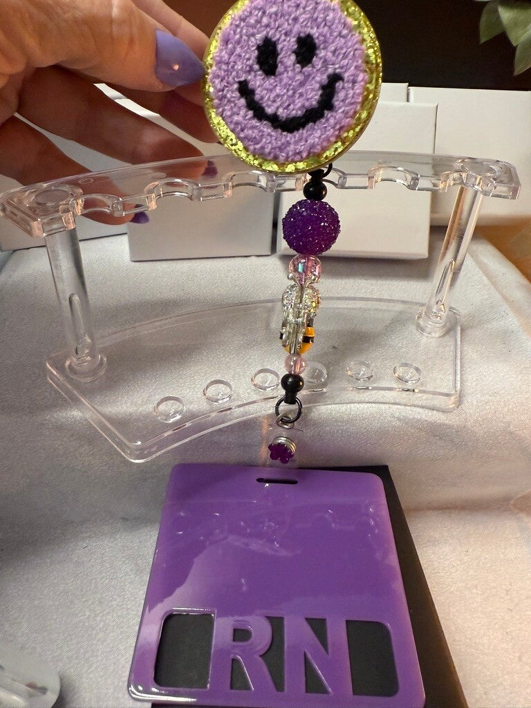 Purple RN Spinner Badge Reel with Smiley Face & Beaded Bee Charm – Fun & Functional for Nurses IDG100025