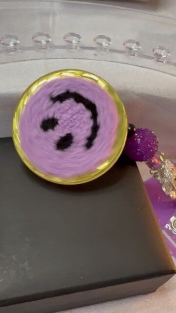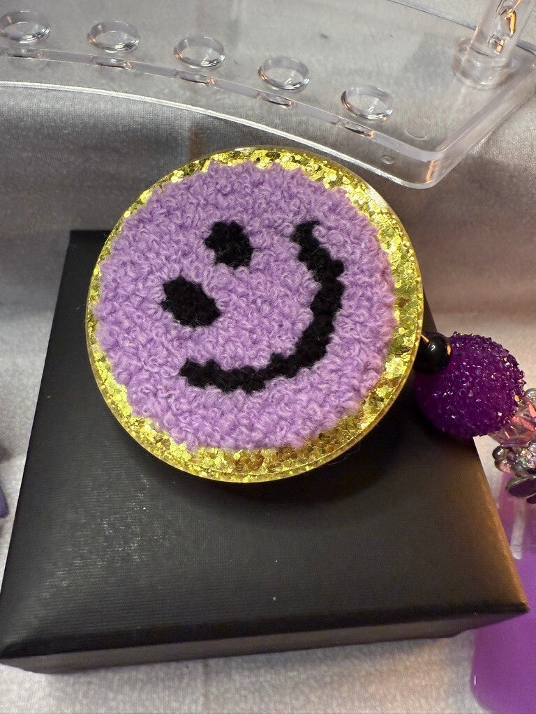 Soft-textured purple smiley face topper with gold trim