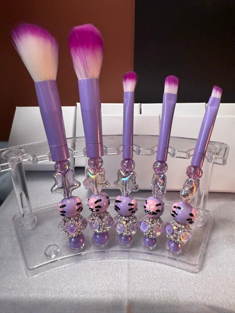 Elevate your beauty routine with this one-of-a-kind purple beaded makeup brush set! Each brush is handcrafted with sparkling rhinestone beads, heart accents, and playful character charms, making them as fun to use as they are to display.